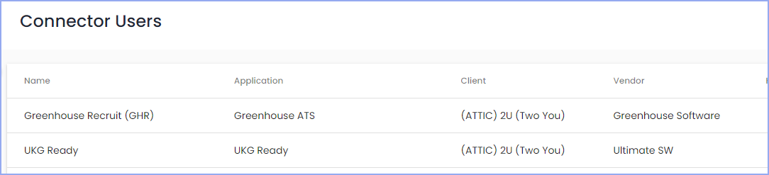 Information about each connector is shown with Name, Application, Client, Vendor, Integration Pattern, etc. Each Connector in your integration will need to be updated with credentials